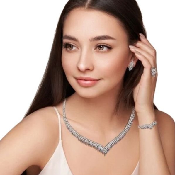طقم سهره نسائي ناعم باللون الفضي ، طقم يتكون من عقد و اقراط وخاتم واسواره ، العقد بتصميم مميز يتزين بأحجار الزركون البراقه المتتابعه بأشكال ناعم متناغمه مع نغم الطبيعه ، والاقراط بتصميم ملفت ومنسدل يتزين بالفصوص البراقه من الزركون ، والخاتم يتميز بتصميم مرصع بفصوص الزركون الهندسيه الناعمة .